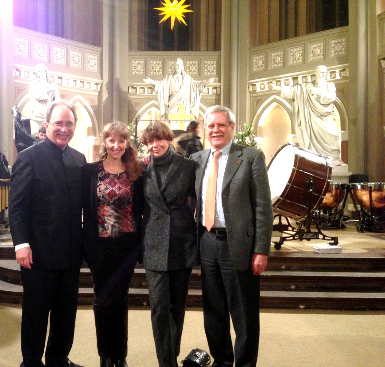 Classmate David Fisher reports: The year started out very busy for us. The Princeton University Orchestra is currently on a European tour. Étel arranged for them to play a concert in the market church in Wiesbaden, which is also known as the Cathedral of the Land of Nassau. Attached is a photo of the orchestra in the church and one of myself, Étel, the conductor, Michael Pratt, and the soloist, Martha Eliott. The concert was a huge success with a record turnout. The skill level of Princeton's musicians blew everyone's mind and resulted in a spontaneous standing ovation at the end. The concert also got nice reviews in the local press including some good PR for Princeton.
