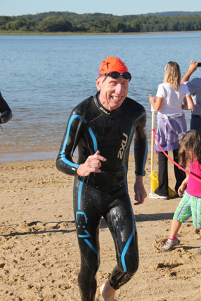 Here, thanks to Clay McEldowney, is a photo of Bill Pape as he won the Skylands Triathlon held on September 9 at Spruce Run Recreation Area NJ, sponsored by the North Hunterdon Rotary Club. Bill blew away all competition in his age group to win the swim, bike and run event.